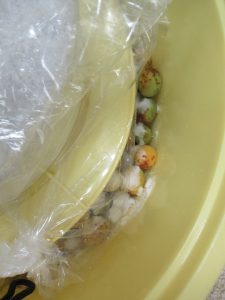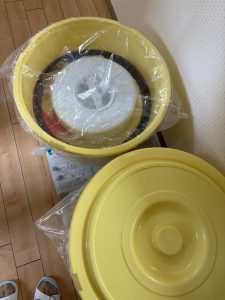 まず「塩漬けの作業」を行います。塩に漬けることで梅の中から水分(梅酢)が出てくるため、梅酢で梅が浸かるまで重しを乗せて脱水をします。